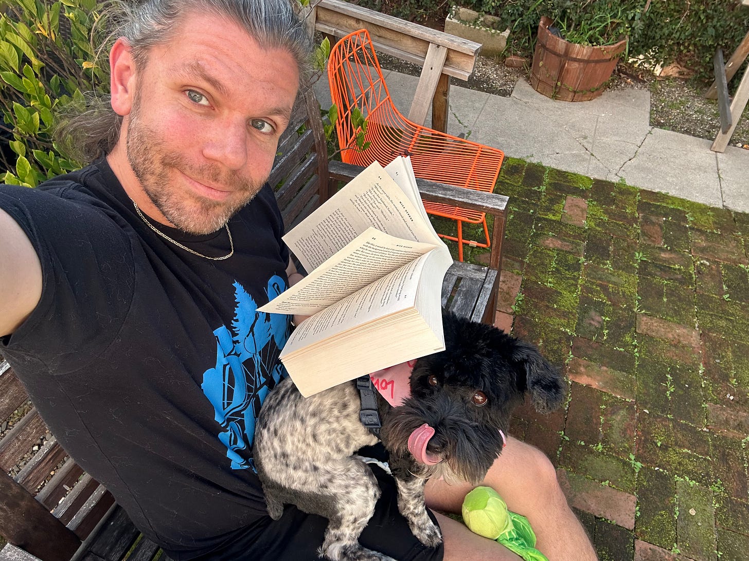 Mick Herron. I have loved the TV show based on one of Herron’s book series, Slow Horses, but I heard his writing was even better than the show’s. Instead of diving in on Horses right after watching, I thought I’d check out his other series, Down Cemetery Road. I’m about 100 pages in aaand lovin’ it. Funny, biting, exciting. Can’t wait to get back to it. Here’s me reading it with my dogsitting charge, Olive: